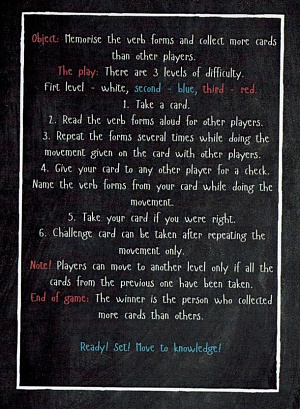 Irregular Verbs - нейро-игра на тренировку и запоминание 90 неправильных глаголов. В игре 3 уровня сложности. Необычным и обязательным условием игры является выполнение непредсказуемых движений, которые способствуют повышению концентрации внимания. Двойная нагрузка на мозг, умственная и физическая, не позволяет отвлечься. Играть можно поэтапно, а также выбирая актуальную для уровня лексику. Нейро-игру можно использовать как на этапе презентации, так и во время грамматической практики и в качестве альтернативной проверки выученного материала.